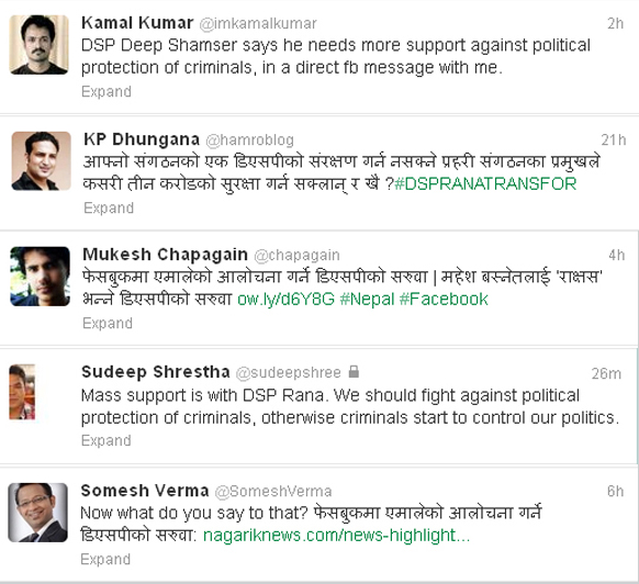 यता डिएसपी राणाले राजनीतिक संरक्षणमा हुने अपराधीकरणविरुद्ध दिएको प्रतिक्रियाकै कारण सरुवा हुनु परेपछि उनको पक्षमा ठूलो जनसमर्थन देखिएको छ। हिरो बन्ने भए फिल्म खेल्न गए हुन्छ भनेर महेस बस्नेतले बताए पनि मंगलबार सोसल मिडियामा उनी साँच्चीकै हिरो सावित भएका छन्। राजनीतिक संरक्षणमा भइरहेका अपारधबाट वाक्क नेपालीले राणालाइ समाजको हिरोकै रुपमा स्वीकार्दै स्ट्याटस लेखेका छन्। मंगलबार नागरिकन्युजमा प्रकाशित समाचारप्रति हजारौं पाठकहरुले रेस्पोन्स जनाएउँदै गुण्डाराज अन्त्यको माग गरेका हुन्। ‘अगाडि बढ राणा तिमीलाइ नेपाली जनताको साथ छ’ शैलीका कमेन्टहरु नागरिकन्युजले प्रकाशित गरेको छ।